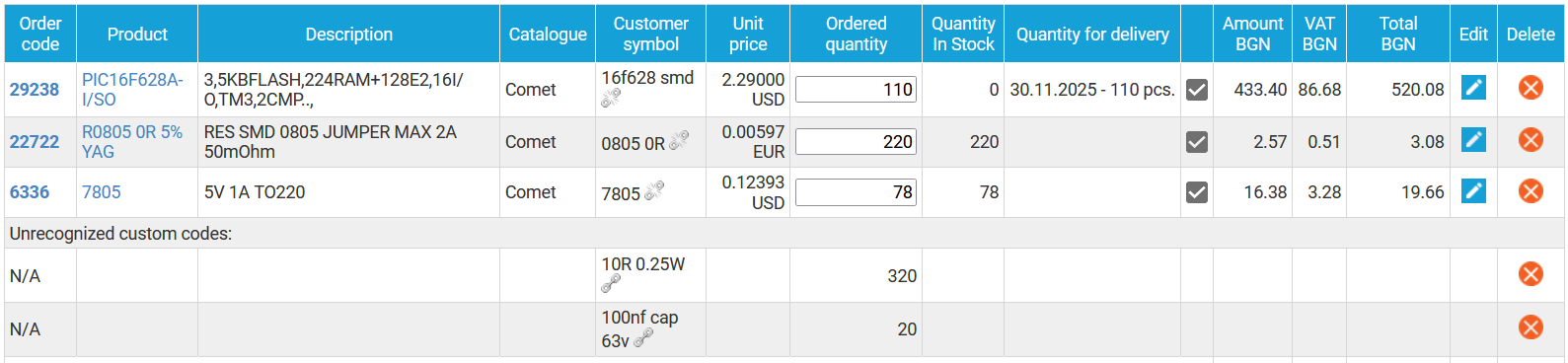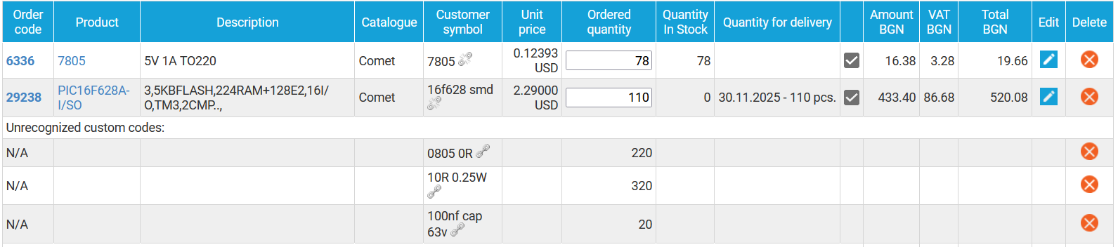 IMPORTANT: If you already placed an order for certain company and associated names of components with Comet Electronics names, they will be shown as recognized only in case that you are working on a new order for the same company.